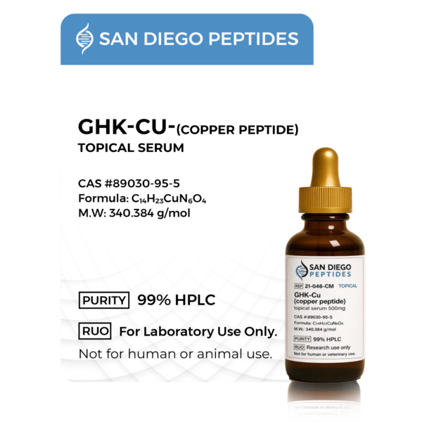 GHK-Cu is commonly utilized in laboratory research focused on peptide chemistry, copper homeostasis, and extracellular matrix dynamics. In topical research models, it is applied to study peptide stability, copper-dependent enzymatic activity, and molecular signaling processes related to tissue structure and regeneration. It is also used in oxidative balance and peptide-metal binding studies.